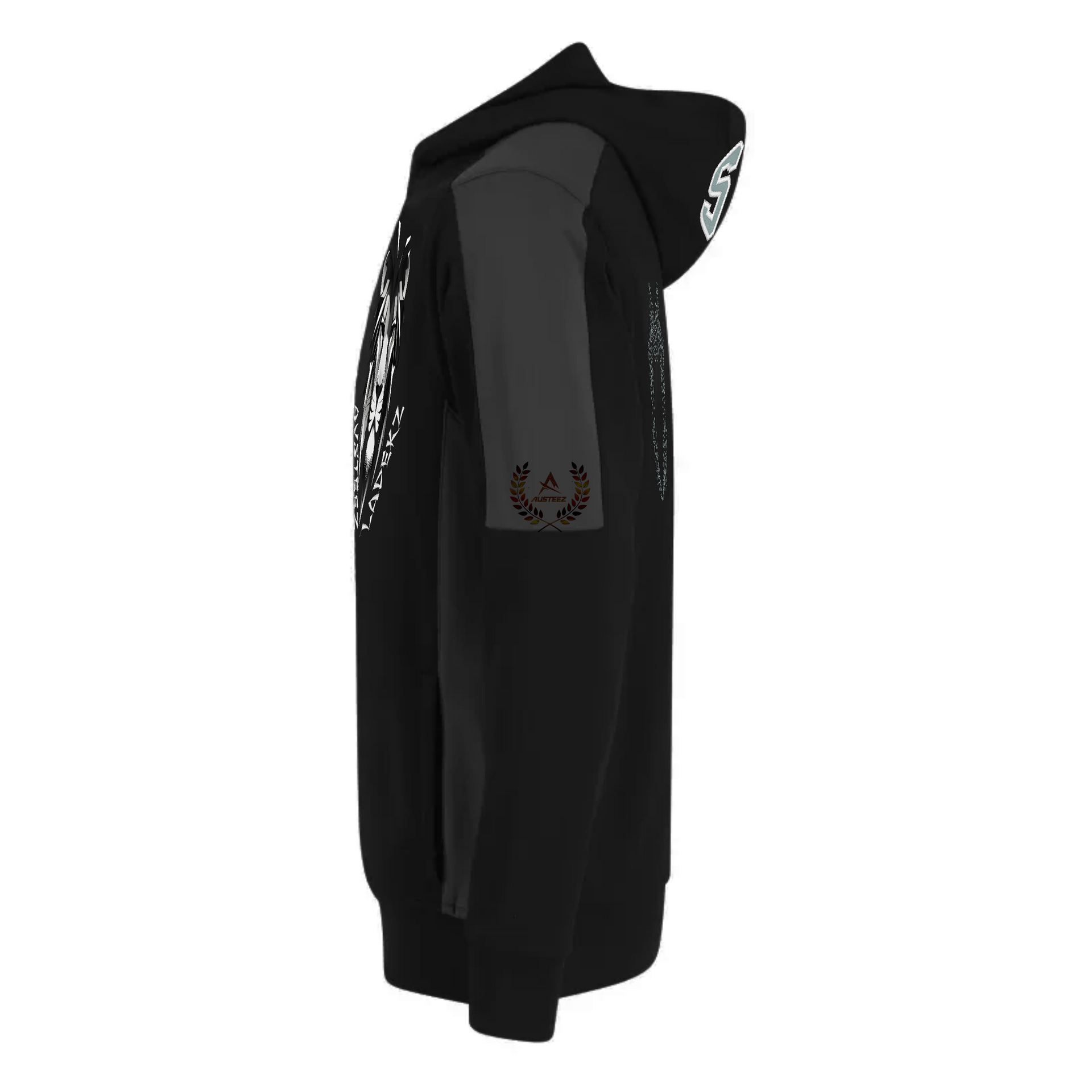 A STZ stylish black hoodie designed for contemporary style and comfort. The hoodie is made predominantly of a smooth fabric, ensuring a cozy fit. Prominently displayed on the front is a striking graphic of a lion's face, characterized by intricate details and a bold design. The lion's mane is stylized, featuring a mix of black and silver tones that add depth and dimension. Below the lion graphic are the embroidered words "AUSTEEZ" and "LADEKZ," presented in a sharp, angular font that complements the fierce imagery.