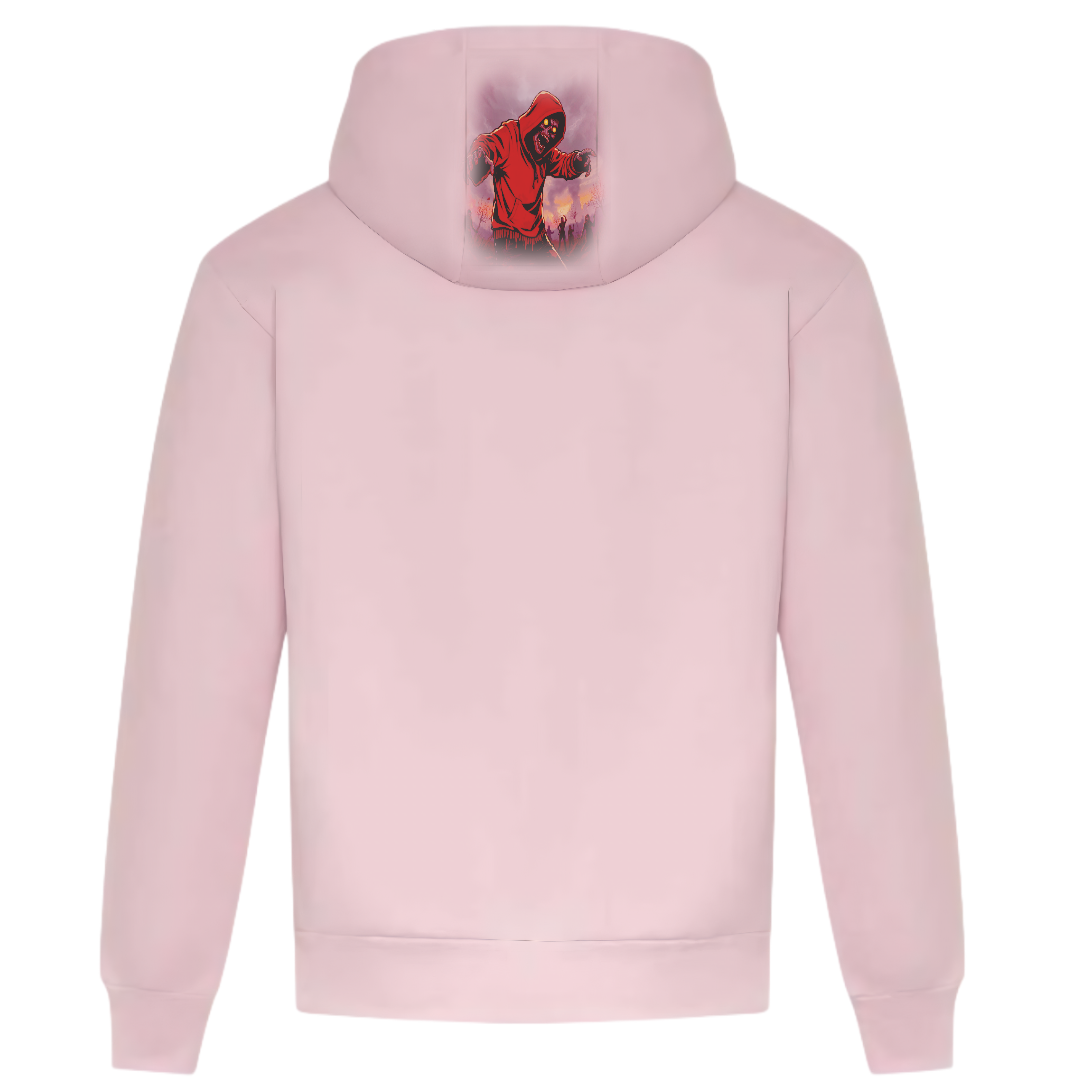 Dieser Hoodie präsentiert sich in trendigem Pink mit einem auffälligen Grafikdesign. Das Design zeigt oben in kräftigen roten Buchstaben den Schriftzug „Zombie“ und darunter den Satz „Vibe IN NATURE“. Im Mittelpunkt steht die markante Illustration einer Zombiefigur in einem roten Hoodie. Der intensive Hintergrund vermittelt eine düstere, unheimliche Atmosphäre. Die Kombination aus leichter, witziger Ästhetik und einem kantigen Touch macht diesen Hoodie perfekt für urbane Mode und ausgefallene Themenkleidung. Die Kapuze ziert eine markante Illustration einer Zombiefigur in einem roten Hoodie. Die klassische Kängurutasche vorne und die gerippten Bündchen bieten Komfort und Funktionalität. Der weiche Stoff eignet sich perfekt für die Freizeit und ist die ideale Wahl für alle, die eine einzigartige Mischung aus Streetwear und Popkultur schätzen. Dieses Produkt vereint eine verspielte Darstellung des Zombie-Themas mit einer modischen Ästhetik und spricht Fans ausgefallener Styles an. 50 % Baumwolle und 50 % Polyester. Ohne Schnüre/Kabel. Sie wagen es, unter den Menschen aufzufallen? Ziehen Sie diesen Kapuzenpullover an!