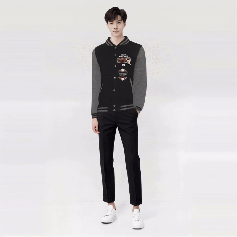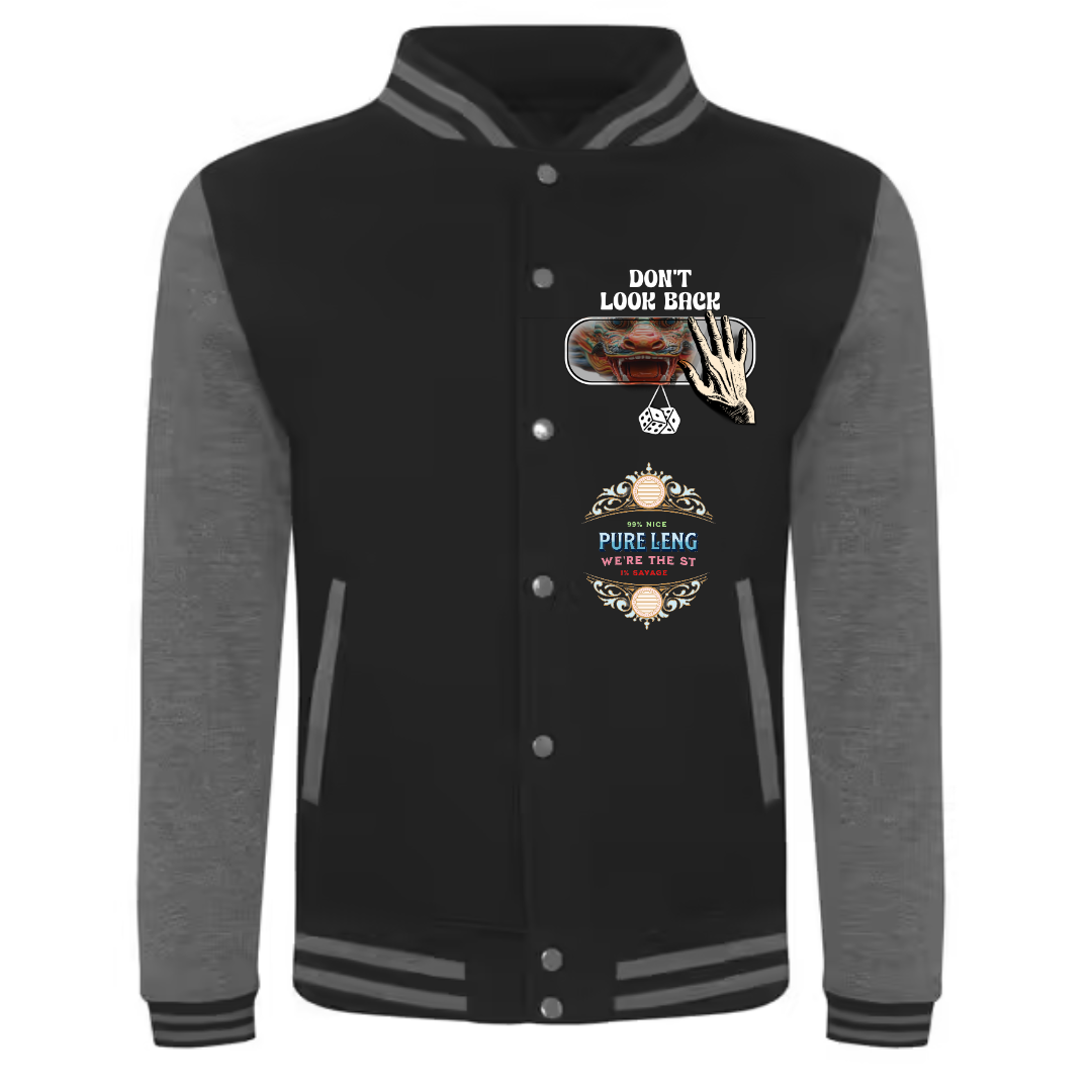 Questa elegante giacca universitaria presenta sul retro un design distintivo che mette in mostra in modo evidente una vivace grafica di drago nota come "LOONG" sul retro. La base della giacca è un solido nero corvino, che consente all'illustrazione colorata del drago di risaltare in modo audace. Il drago è intricatamente dettagliato, con vivaci tonalità di blu, rosso e oro, che ne enfatizzano la maestosa presenza. Ad aggiungere fascino unico alla giacca, ci sono un orlo e polsini a coste a strisce colorate che incorporano una tavolozza di grigio e nero, migliorando l'interesse visivo complessivo. La parte anteriore della giacca vanta un logo minimalista del marchio, mentre il testo d'impatto sul retro recita "BUILT DIFFERENT", "PURE LENG", "DRIP MODE ACTIVATED" sottolineato da un accattivante design a timbro circolare in rosso. Materiale: poliuretano, cotone e poliestere. Senza cordino/senza cordino.